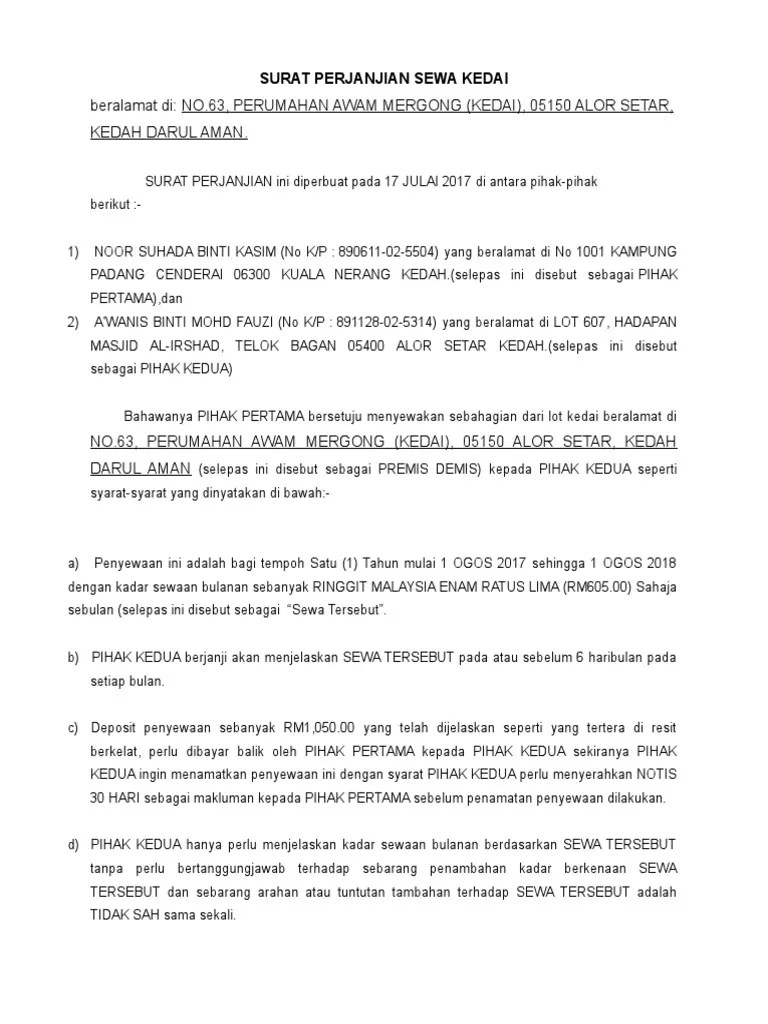 Surat perjanjian sewa rumah (premis kedai no.1) dan saya sazlinda binti saidin. Bahawasanya tuan kedai adalah tuanpunya berdaftar ke atas premis yang di . Info mengenai perjanjian sewa kedai. Perjanjian sewa kedai dan premis. Dalam perjanjian sewa kan ada kegunaan sewaan seperti untuk kediaman je, jadi penyewa tak boleh guna untuk: Setiap kali berlaku urusan sewa bangunan atau sewa .